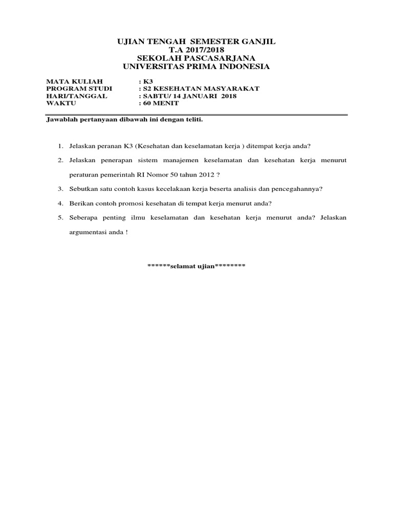 (Rev)01 modul keselamatan kerja &kesling sem 1. Jelaskan tujuan keselamatan dan kesehatan kerja (k3). Contoh surat permohonan jaminan penawaran. Bantu jawab dan dapatkan poin. Demikian artikel contoh rencana keselamatan dan kesehatan kerja konstruksi terbaru ini, semoga bermanfaat. Jelaslah bahwa masalah keselamatan kerja sebagai salah satu masalah personalia, tidak hanya menjadi perhatian karyawan dan pengusaha, tetapi juga pemerintah. Keselamatan kesehatan kerja ( k3 ) adalah upaya perlindungan yang ditujukan agar tenaga kerja dan orang lainnya ditempat kerja/perusahaan selalu dalam keadaan selamat dan sehat, serta agar setiap sumber produksi dapat digunakan secara aman dan efisien kepmenaker nomor. Keselamatan dan kesehatan kerja merupakan suatu pemikiran dan upaya untuk menjamin keutuhan dan kesempurnaan baik jasmani maupun rohani. Mengenal program keselamatan dan kesehatan kerja (k3). #1 didukung oleh manajemen puncak (top management). Yang juga harus dijelaskan kepada semua pekerja/buruh.