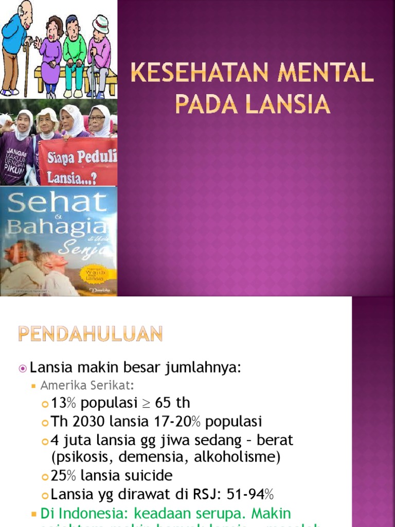 PPT UNTUK LANSIA. All formats available for pc, mac, ebook readers and other mobile devices. Bimbingan konseling keagamaan bagi kesehatan mental lansia. Beberapa karakteris k lansia yang perlu diketahui untuk mengetahui keberadaan masalah kesehatan lansia adalah: Abstrak ditinjau dari aspek kesehatan, kelompok lansia akan mengalami penurunan derajat kesehatan baik secara alamiah maupun akibat penyakit. Makalah ini membahas mengenai menjaga kesehatan kardiovaskuler ( jantung dan peredaran darah) untuk usia lanjut. Ketika psikologi agama dan kesehatan mental masuk dalam ruang islamisasi, keduanya … Kesehatan mental pada lansia (lanjut usia) definisi aging (proses penuaan) aging atau aging atau penuaan berhubungan dengan adanya dua fenomena, yaitu penurunan fisiologik tubuh dan peningkatan terjadinya penyakit (fowler, 2003). Tidak hanya bicara penyakit, tapi masalah2 penyesuaian diri (dalam arti luas) dan upaya2 menjadi sehat mental. Kesehatan mental lebih banyak menekankan perhatiannya pada gangguan mental daripada mengupayakan. Mencari upaya semaksimal mungkin agar para lansia yang menderita suatu. Download kesehatan mental for free. Konsep kesehatan mental merupakan salah satu kajian utama dalam psikologi klinis. N stres, konflik, frustasi n dukungan sosial n penyesuaian diri, pengembangan potensi n masalah2 kesmen yang lebih patologis n penanganan/ intervensi n. Lebih dari separuh populasi lansia mempunyai tekanan darah yang lebih dari normal. Partisipasi lansia dalam aktivitas fisik.