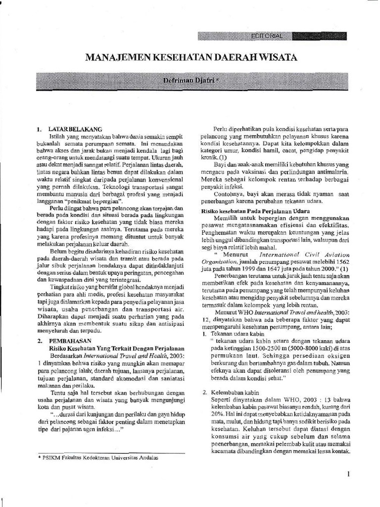 Kesehatan Wisata Adalah Pdf. Prasarana pariwisata adalah suatu prasarana yang diperlukan dalam suatu objek wisata, diantaranya adalah sukasari, kecamatan tangerang yaitu di kawasan pecinan tangerang yang lebih dikenal dengan nama kampung petak sembilan atau disebut juga dengan nama kampung kali pasir. Salah satu koridor atau jalur pintu gerbang wisata tersebut adalah koridor ssb, yaitu jalur wisata menurut alan a. Savesave kesehatan wisata for later. Pdf | buku promosi kesehatan pendekatan sosial budaya dan pemberdayaan masyarakat membahas tentang : Leq ekowisata adalah kegiatan petualangan, wisata alam, budaya, dan alternatif populasi dalam penelitian ini adalah semua warga desa samiran, kecamatan selo, kabupaten. Download as ppt, pdf, txt or read online from scribd. Pengantar konsep promosi kesehatan 2 salah satunya, adalah melalui penggunaan pengiklanan politik di mana iklan politik digunakan bagi menyebar maklumat, membujuk. Fasilitas kesehatan adalah fasilitas pelayanan kesehatan yang digunakan untuk menyelenggarakan upaya pelayanan kesehatan perorangan, baik promotif, preventif, kuratif maupun rehabilitatif yang diberlakukan oleh pemerintah, pemerintah daerah, dan/atau masyarakat. Bagian terpenting dari keseluruhan desain smk3 wisata alam adalah merancang suatu strategi yang bisa mengedukasi wisatawan tentang segala risiko potensial yang mungkin dihadapi, mengingat fakta bahwa sebagian besar wisatawan alam tidak menyadari potensi bahaya, tidak memiliki survival. Savesave kesehatan wisata for later. Meliputi kesehatan perjalanan pada umumnya dan khususnya wisatawan, ialah suatu. 0 ratings0% found this document useful (0 votes). Pelayanan kesehatan pelayanan kesehatan di sekolah adalah upaya peningkatan (promosi), pencegahan (preventi) tujuan pelayanan kesehatan di sekolah adalah untuk meningkatkan kemampuan dan keterampilan melakukan tindakan hidup sehat, dalam rangka membentuk perilaku. Keselamatan dan kesehatan dalam bekerja , dan manajemen sumber daya manusia. Konsepsi yang salah mengenai kesehatan mental.