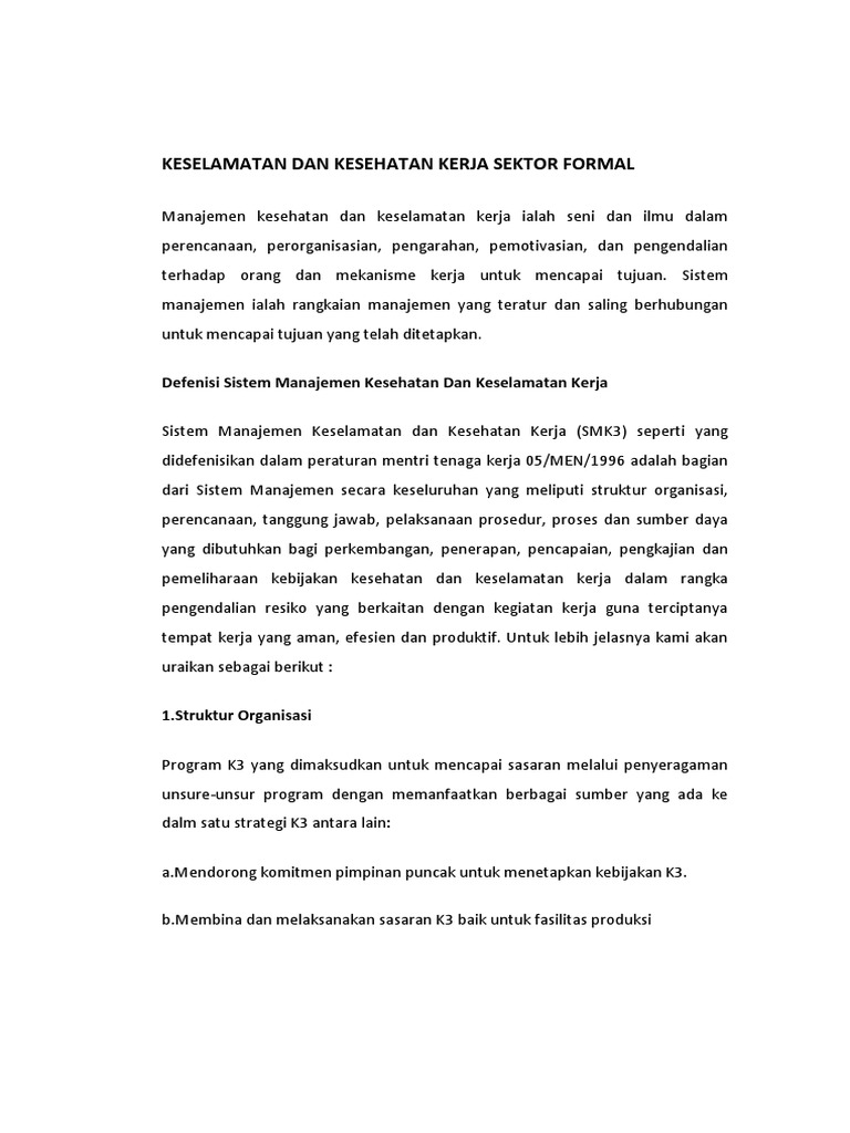 Kesehatan Kerja Sektor Informal. Keselamatan serta kesehatan kerja ialah suatu kondisi dalam pekerjaan yang sehat serta aman baik itu bagi kerjaannya, perusahaan atau bagi masyarakat serta lingkungan sekitar pabrik atau tempat kerja itu. Contoh surat permohonan jaminan penawaran. Manajemen keselamatan dan kesehatan kerja. Peran pemerintah dalam menanggulangi masalah k3. Program keselamatan dan kesehatan kerja dalam uu k3. Kegiatan dan penerapan k3 terhadap tenaga kerja di sector formal, pada umumnya sudah diterapkan dengan baik. Keselamatan serta kesehatan kerja adalah suatu usaha untuk mencegah tiap tindakan. Setalah itu akan tampil detail/informasi keselamatan kesehatan kerja di bawah ini. Dalam upaya pokok puskesmas terdapat upaya kesehatan kerja (ukk) yang kiprahnya lebih pada sasaran sektor informal (petani, nelayan. Pada departemen kesehatan sendiri ditangani oleh pusat kesehatan kerja depkes. Keselamatan dan kesehatan kerja pertambanganfull description. Demikian artikel contoh rencana keselamatan dan kesehatan kerja konstruksi terbaru ini, semoga bermanfaat. Detail informasi mengenai keselamatan kesehatan kerja dapat dilihat melalui tautan yang terdapat disebelah kanan dari data tiap perusahaan dalam daftar perusahaan terdaftar di halaman kelola perusahaan. Kesehatan dan keselamatan kerja (k3, terkesan rancu apabila disebut keselamatan dan kesehatan kerja) adalah bidang yang terkait dengan kesehatan, keselamatan, dan kesejahteraan manusia yang bekerja di sebuah institusi maupun lokasi proyek. Keselamatan dan kesehatan kerja (k3) merupakan salah satu perlindungan tenaga kerja di segala jenis kegiatan usaha, baik formal maupun informal.