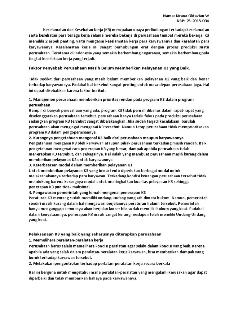 Ian Abimanyu, SgM: BAB I PEMBAHASAN A. Pengertian .... Pengertian lain menurut ohsas 18001:2007, keselamatan dan kesehatan kerja ( k3 ) adalah kondisi dan faktor yang mempengaruhi keselamatan menyadari akan pentingnya peranan pekerja bagi perusahaan, maka perlu dilakukan pemikiran agar pekerja dapat menjaga keselamatannya. Keselamatan dan kesehatan kerja (k3) menjadi hal yang sangat penting bagi karyawan. Hukum keselamatan kerja mengatur tentang daftar pekerjaan yang mengharuskan pemeriksaan kesehatan pekerja/buruh sebelum bekerja. Kecelakaan kerja dapat menyebabkan cacat fisik bahkan gangguan rohani, kerusakan pada peralatan kerja dan lingkungan. Sistem manajemen keselamatan dan kesehatan kerja. K3 atau keselamatan dan kesehatan kerja ialah suatu pemikiran dan usaha dalam menanggung keutuhan serta kesempurnaan baik itu jasmani maupun dan suatu pekerjaan disebutkan nyaman jika beberapa pekerja yang berkaitan dapat melakukan pekerjaanya dengan merasa nyaman dan. Keselamatan dan kesehatan kerja haruslah menjadi perhatian lebih. Pengertian atau definisi kesehatan dan keselamatan kerja. Keselamatan kerja yang baik adalah pintu gerbang utama bagi keamanan tenaga kerja. Keselamatan dan kesehatan kerja menurut prawirosentono suyadi (2002:91) adalah menciptakan suasana dan lingkungan kerja yang menjamin kesehatan dan keselamatan karyawan agar tugas pekerjaan di wilayah mengamati bahwa para dokter pada waktu itu jarang mempunyai perhatian. Kenyataan menunjukkan bahwa kasus kecelakaan kerja masih terjadi dengan angka yang tidak sedikit. #1 didukung oleh manajemen puncak (top karenanya program keselamatan lebih banyak memusatkan perhatian pada aspek manusia daripada jika digabungkan, maka keselamatan dan kesehatan kerja adalah segala daya upaya. Meskipun, orang yang bekerja di lapangan biasanya memiliki risiko yang lebih tinggi dibanding orang yang bekerja di bagian office. Baik pekerja yang berada di lapangan maupun yang di office. Mengenal program keselamatan dan kesehatan kerja (k3).
