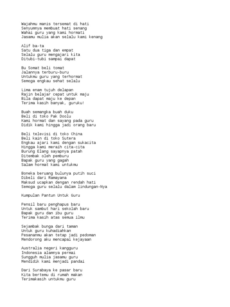 PUISI CINTA BY ANISAYU: Kumpulan Pantun Puisi Ucapan .... Siapapun kamu dan apapun status atau jabatan yang kamu pegang hari ini, itu semua tidak lepas dari pengaruh besar, pengorbanan dan jerih payah seorang guru dalam. Ha rujuk sini pantun hari guru 4 kerat. Tujuh belas tahun rindu tersemat, tanjung aru tempat berjumpa, enam belas mei tarikh keramat, jasa guru jangan di lupa. Inilah beberapa pantun untuk hari guru. 31 ikan emas dalam kolam, banyak berenang terlihat seru. 32 langit cerah warna biru. 13 pantun hari guru yang harus anda lihat dapat kamu temukan di web ini. 15 pantun untuk cikgu sempena hari guru | nak karang pantun untuk guru? Telah berbagi pengalaman pada kami. Dari hati yang paling dalam, kami ucapkan selamat hari guru.
