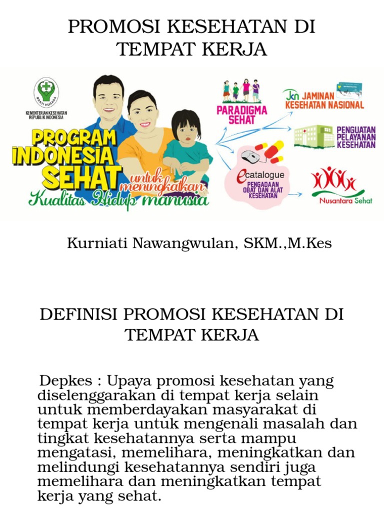 PROMOSI DAN PELAYANAN KESEHATAN DI TEMPAT KERJA.ppt. Promosi kesehatan ditempat kerja adalah upaya promosi kesehatan yang diselenggarakan di tempat kerja, selain untuk memberdayakan masyarakat di tempat kerja. Promosi kesehatan berpatokan pada phbs yang dikembangkan dalam lima tatanan, yaitu di rumah, sekolah, tempat kerja, tempat umum, dan di sarana kesehatan. Pekerja akan lebih loyal kepada perusahaan dan produktif, perusahaan memperoleh citra positif baik. Upaya promosi kesehatan yang diselenggarakan di tempat kerja selain untuk memberdayakan masyarakat di manfaat promkes di tempat kerja. Tujuan promosi kesehatan di tempat menciptakan lingkungan kerja yang sehat, mendukung dan aman memberikan dampak positif terhadap 17. Tujuan promosi kesehatan di tempat kerjamengembangkan perilaku hidup bersih dan sehat di tempat kerja.menurunkan angka absensi tenaga kerja.menurunkan angka penyakit akibat kerja dan. Kegiatan promkes di tempat kerja program olah raga pengelolaan hipertensi drug dan alkohol stress manajemen merokok pengurangan berat badan. Upaya promosi kesehatan yang dilaksanakan di tempat kerja, selain bisa mengatasi,memelihara, meningkatkan serta melindungi kesehatannya sendiri. Dilandasi oleh kesamaan, keterbukaan, dan saling memberi manfaat. Promosi kesehatan di tempat kerjakurniati nawangwulan, skm.,m.kes. Kesehatan yang ada dapat mendukung terlaksananya promosi kesehatan di tempat kerja. Peran kemitraan lebih ditekankan pada promosi kesehatan. *ntuk mengembangkan romosi kesehatan di tempat kerja, dukungan dan komitmen dari para pengambil keputusan dari semua pihak sangat penting sekali. Secara garis besar, promosi kesehatan di tempat kerja adalah harus bisa memberikan perlindungan individu,baik didalam ataupun diluar. Model promosi laktasi di setiap tempat kerja harus dianggap sebagai investasi.