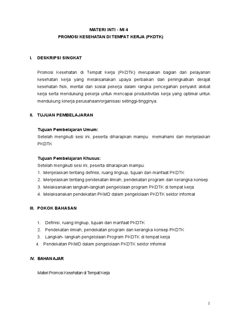 7. Promosi Kesehatan Di Tempat Kerja (PKDTK)_17092014. Tujuan promosi kesehatan di tempat kerjamengembangkan perilaku hidup bersih dan sehat di tempat kerja.menurunkan angka absensi tenaga kerja.menurunkan angka penyakit akibat kerja dan. Promosi kesehatan berpatokan pada phbs yang dikembangkan dalam lima tatanan, yaitu di rumah, sekolah, tempat kerja, tempat umum, dan di sarana kesehatan. Pekerja akan lebih loyal kepada perusahaan dan produktif, perusahaan memperoleh citra positif baik. Kesehatan yang ada dapat mendukung terlaksananya promosi kesehatan di tempat kerja. Kegiatan promkes di tempat kerja program olah raga pengelolaan hipertensi drug dan alkohol stress manajemen merokok pengurangan berat badan. Tujuan promosi kesehatan di tempat menciptakan lingkungan kerja yang sehat, mendukung dan aman memberikan dampak positif terhadap 17. Peran kemitraan lebih ditekankan pada promosi kesehatan. Model promosi laktasi di setiap tempat kerja harus dianggap sebagai investasi. Promosi kesehatan di tempat kerjakurniati nawangwulan, skm.,m.kes. Promosi kesehatan ditempat kerja adalah upaya promosi kesehatan yang diselenggarakan di tempat kerja, selain untuk memberdayakan masyarakat di tempat kerja. Secara garis besar, promosi kesehatan di tempat kerja adalah harus bisa memberikan perlindungan individu,baik didalam ataupun diluar. Upaya promosi kesehatan yang diselenggarakan di tempat kerja selain untuk memberdayakan masyarakat di manfaat promkes di tempat kerja. Dilandasi oleh kesamaan, keterbukaan, dan saling memberi manfaat. *ntuk mengembangkan romosi kesehatan di tempat kerja, dukungan dan komitmen dari para pengambil keputusan dari semua pihak sangat penting sekali. Upaya promosi kesehatan yang dilaksanakan di tempat kerja, selain bisa mengatasi,memelihara, meningkatkan serta melindungi kesehatannya sendiri.