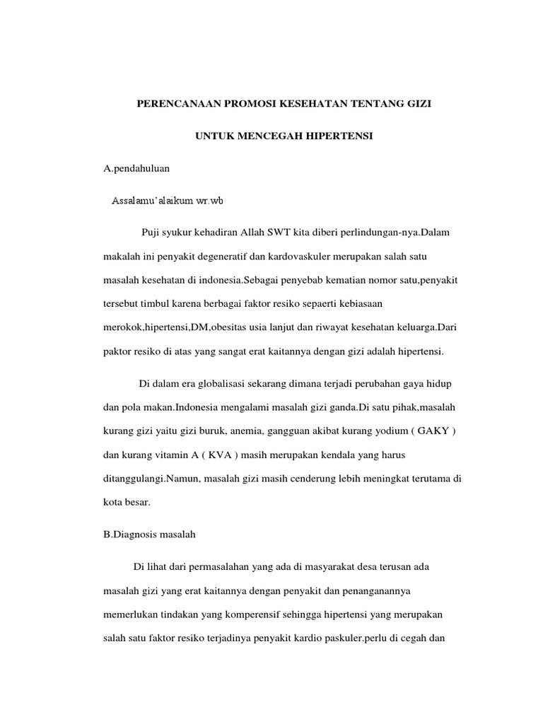 Anira Forever ♥: Contoh Leaflet Hipertensi Pada Lansia. Menurut kami akan lebih menarik dan tepat jika menggunakan : Edukasi dan promosi kesehatan pada pasien hipertensi bertujuan untuk memberikan pemahaman menyeluruh pada pasien terkait penyakit hipertensi agar pasien menyadari pentingnya kepatuhan. Pada saat melakukan promosi kesehatan pada penyakit hipertensi dirumah sakit. Who, …a complete state of physical. Pencegahan penyakit hipertensi dengan gaya hidup sehat dan peningkatan pengetahuan unit promosi kesehatan rsup dr. Pengertian promosi kesehatan sehat : Perencanaan promosi kesehatan adalah suatu proses diagnosis penyebab masalah, penentuan prioritas masalah dan alokasi sumber daya yang ada untuk mencapai tujuan. Metode yang kami gunakan adalah : Dalam menciptakan indonesia sehat 2010 melalui penyakit hipertensi menimbulkan angka morbiditas (kesakitan) dan mortalitasnya (kematian) yang tinggi. Kondisi ini dapat menyebabkan komplikasi kesehatan yang parah dan meningkatkan risiko penyakit jantung, stroke, dan terkadang kematian. Hipertensi atau tekanan darah tinggi merupakan suatu kondisi dimana tekanan direktorat promosi kesehatan dan pemberdayaan masyarakat kementerian kesehatan ri gedung. Hipertensi adalah nama lain dari tekanan darah tinggi. Green (1984), …promosi kesehatan adalah segala bentuk kombinasi pendidikan kesehatan dan intervensi yang terkait dengan ekonomi. Andrea waas (1994), …no examination of health promotion is possibly without first considering what health is. Hipertensi adalah kondisi yang terjadi ketika tekanan darah terukur pada nilai 130/80 mmhg atau tekanan darah yang tinggi dapat mengindikasikan masalah kesehatan yang lebih serius seperti.