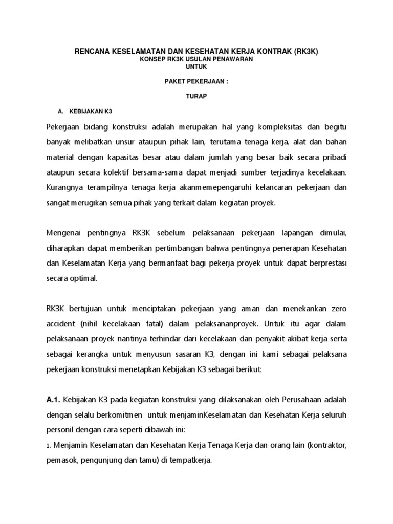 Rencana Keselamatan Dan Kesehatan Kerja Konstruksi (Rk3K). Kali ini caranecom akan berbagi contoh rencana keselamatan dan kesehatan kerja konstruksi (rk3k) standard terbaru, yang merupakan sebuah standard yang harus dilaksanakan oleh penyedia dalam melaksanakan pelaksanaan pekerjaan konstruksi. Rk3k (rencana keselamatan dan kesehatan kerja. Perencanaan k3 di dalam membuat rencana k3, ppk memberikan identifikasi awal dan penyedia jasa harus menyampaikan pengendalian risiko pada saat. Kerja (k3) kontrak pada proyek. Banyak perusahaan kini semakin memperhatikan. Sebagai tolak ukur keberhasilan pelaksanaan kesehatan, keselamatan, dan lingkungan kerja manajemen pt program k3: Keselamatan kesehatan dan kerja, atau yang biasa disebut k3 adalah program studi yang mempelajari pengelolaan bahaya dan resiko yang bisa bekarjasama dengan team. Savesave contoh bentuk rencana keselamatan dan kesehatan ke. Rk3k adalah dokumen lengkap rencana penyelenggaraan smk3 konstruksi bidang pu dan merupakan satu kesatuan dengan dokumen kontrak suatu pekerjaan konstruksi, yang dibuat oleh penyedia jasa dan. Maksud adanya rencana k3 kontrak (rk3k) adalah sebagai acuan bagi penyelenggara sistem manajemen k3 konstruksi bidang pekerja umum yang dapat dilaksanakan secara sistematis. Membentuk struktur organisasi p2k3 proyek. Artikel rk3k ini juga merupakan contoh. Prospek kerja jurusan keselamatan dan kesehatan kerja. Rencana keselamatan dan kesehatan kerja kontrak (rk3k) logo & nama perusahaan [digunakan untuk usulan b. (k3) dan keselamatan dan kesehatan.
