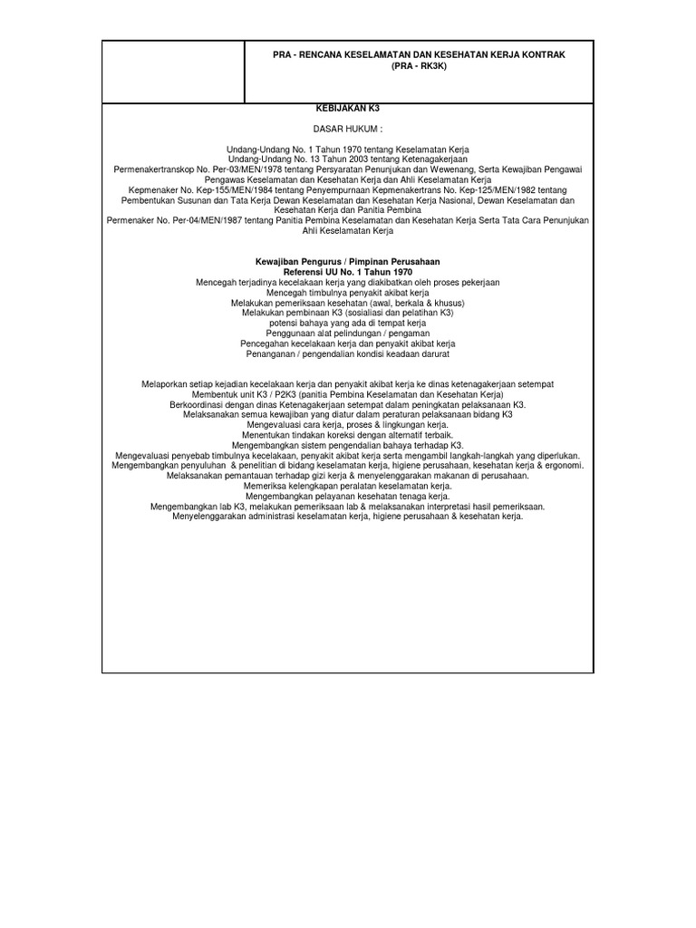 Pra Rencana Keselamatan Dan Kesehatan Kerja Kontrak Pra ... , Rencana Keselamatan Dan Kesehatan Kerja Kontrak (Rk3K) 1.
